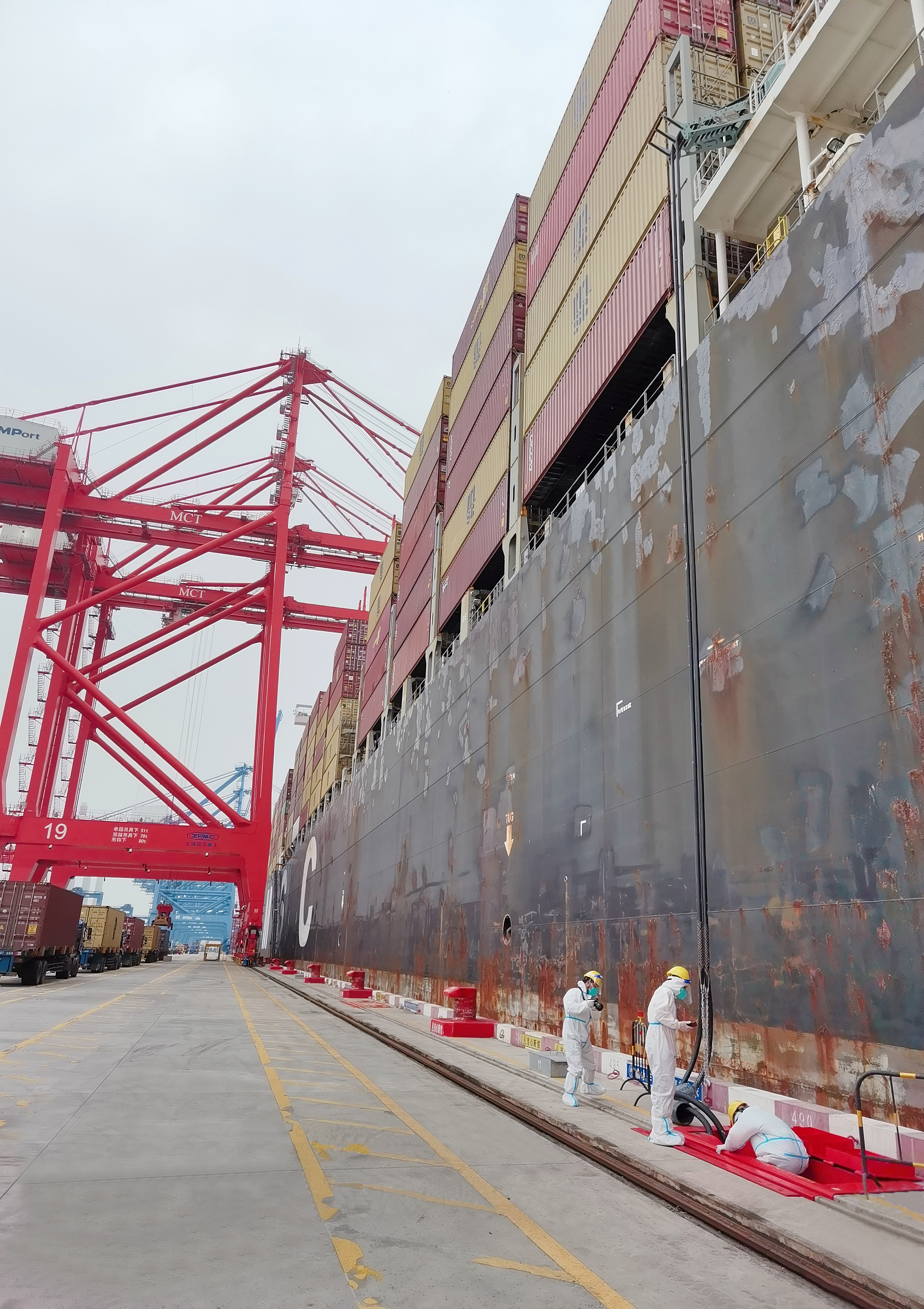 本次用电船只为“MSC CAMILLE(地中海卡米尔)轮”是一艘巴拿马籍巨轮,船长365.52米、横梁51 米,总吨位153092吨,载重量165644吨,是世界上最大的集装箱船之一。