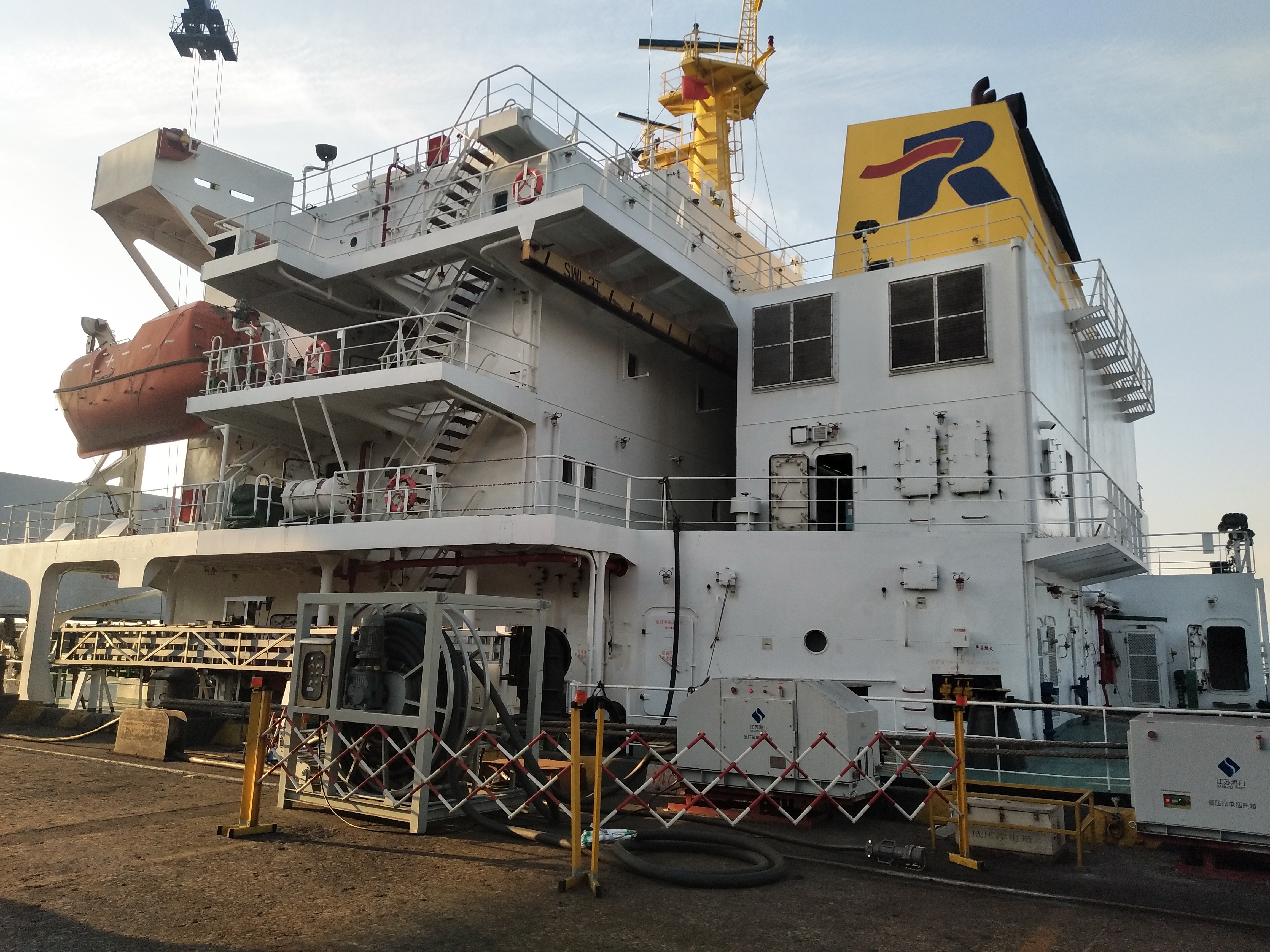 2021年11月15日下午,随着船舶轮机操作人员将岸电开关合闸,5万吨级散货船——“长春门”轮在南京新生圩港成功完成低压岸电连船送电作业,岸电同步并网一次成功。